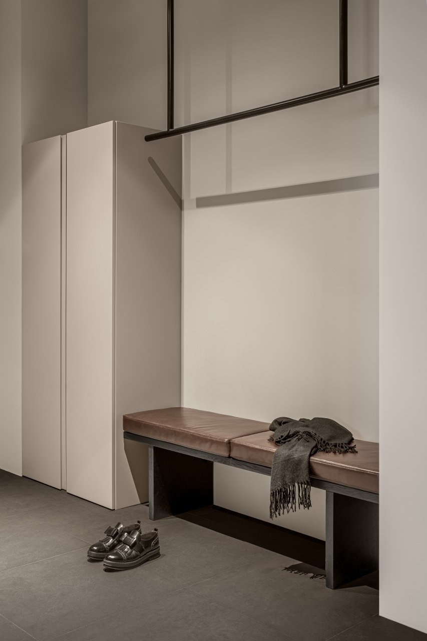 Необычная форма прикроватных столиков из массива тонированного ясеня подчеркивает всю элегантность этой спальни!Зона прихожей, где можно присесть на удобную лавку из массива ясеня с мягкими подушками из эко-кожи.